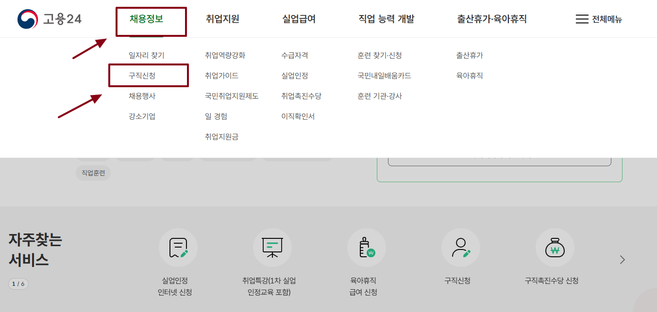 고용24에 접속하여 로그인 후 ‘마이페이지’에서 입사지원 내역을 확인합니다. 여기서 지원한 회사명과 지원일자를 확인할 수 있습니다.