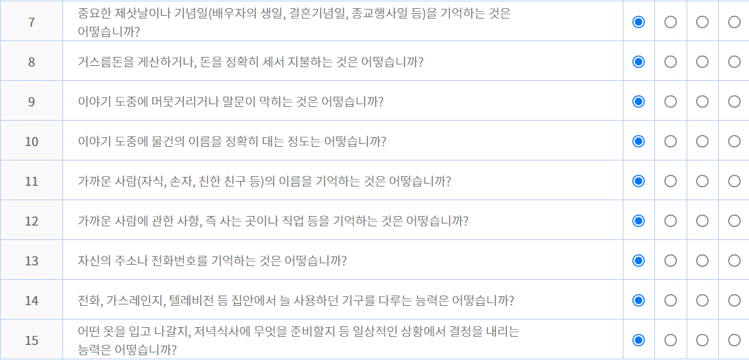 ④ 질문 답변: 일상생활에서의 기억력, 언어 능력, 판단력 등에 관한 질문에 답변합니다.